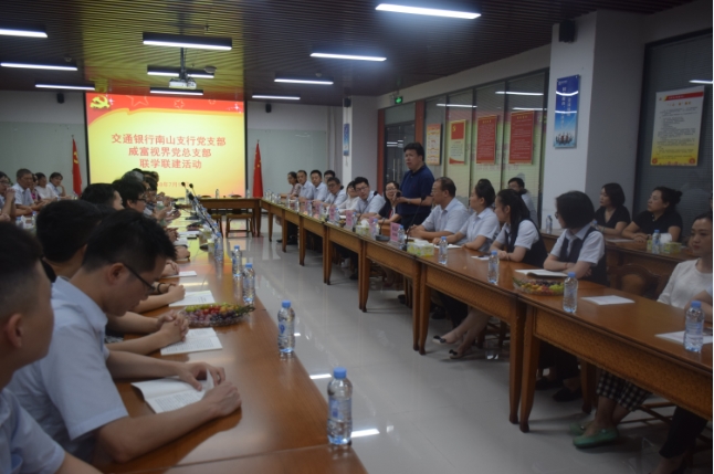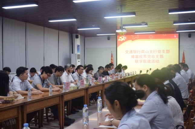 2018年7月18日晚,交通银行南山支行党支部与深圳市威富视界有限公司党总支部在威富集团总部开展了联学联建活动。交通银行南山支行党支部书记张伟胜、副书记高静、纪检委员沈向东、宣传委员郭孟瑶、青年委员杜哲、女工委员彭澎、深圳市威富视界有限公司党总支部书记张少林、纪检委员兼深圳市威富视界有限公司党支部书记梁先扬、组织委员兼深圳市威富智能设备有限公司党支部书记关航健、生活委员兼深圳市威通科技有限公司党支部书记肖波、党办主任杨燕丽、深圳市威通科技有限公司党支部组织委员乔亚飞及各支部党员60余人参加了活动,活动由威富视界党总支部书记张少林主持。
