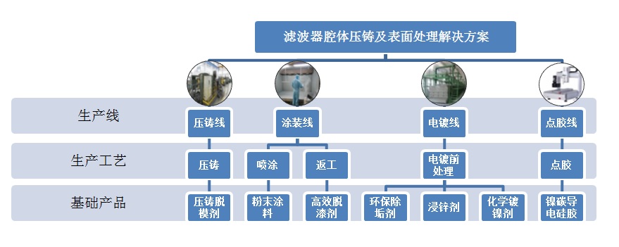 滤波器腔体压铸及表面处理荣耀体育在线登录入口涉及到滤波器腔体的压铸、涂装、电镀、点胶四个工艺流程,包括了压铸脱模剂、粉末涂料、高效脱漆剂、环保除垢剂、浸锌剂、化学镀镍剂、镍碳导电硅胶共七种基础应用(中国)网站首页。以上均由威富集团材料研发中心自主研发而成。